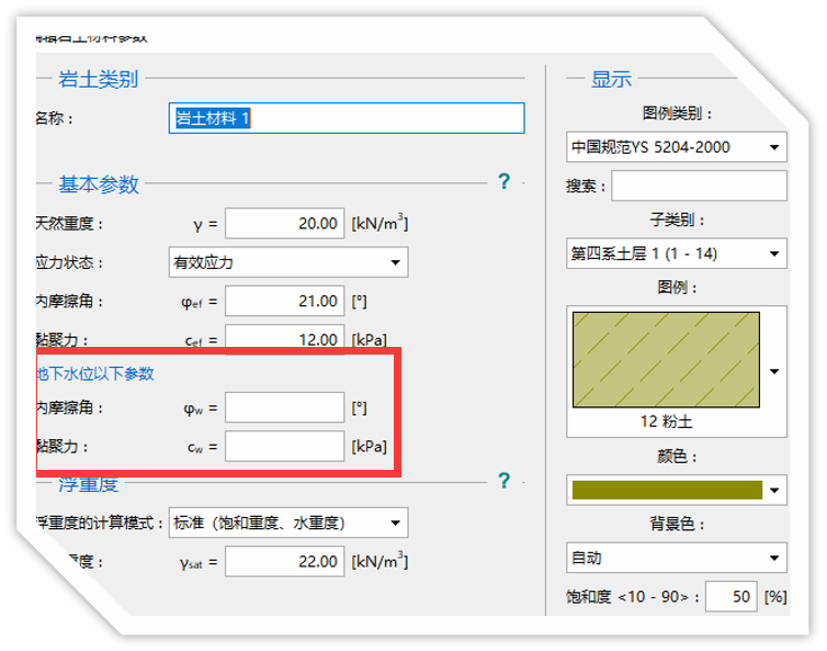 功能1:可以同时输入岩土材料的天然参数和饱和参数,软件计算时,会自动判别土层在水位线之上,还是水位线之下,自动选择水上、水下参数进行计算。