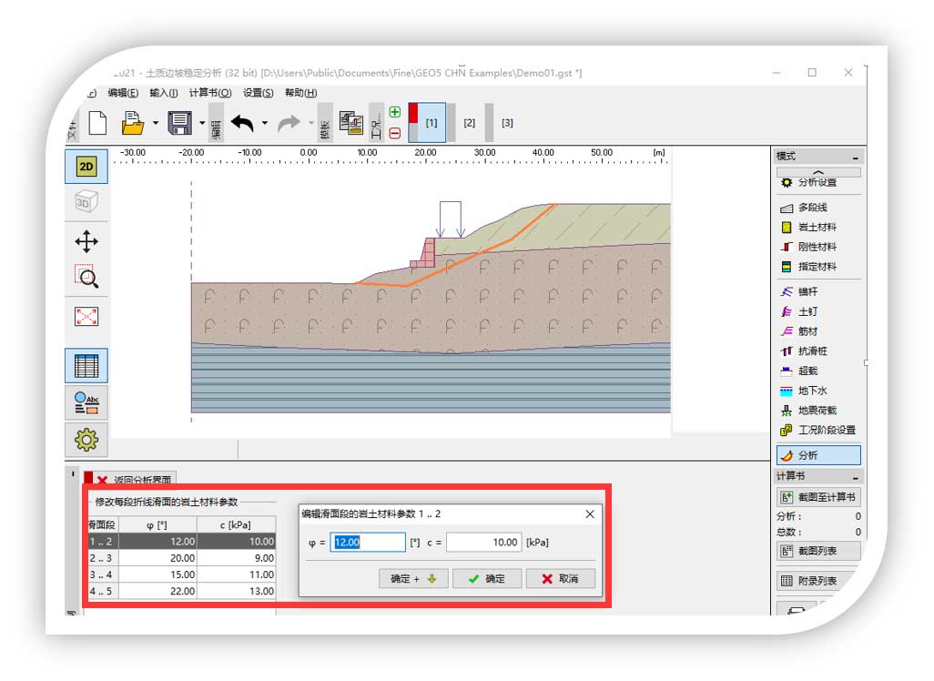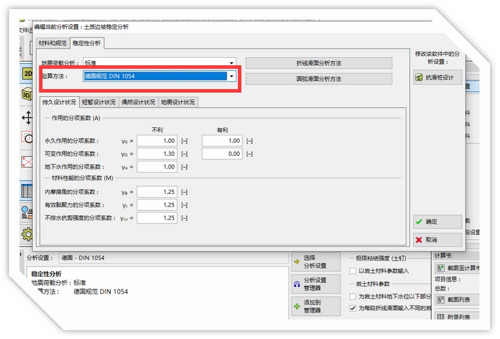 功能3:可以根据德标输入相关参数,进行边坡的稳定性分析。