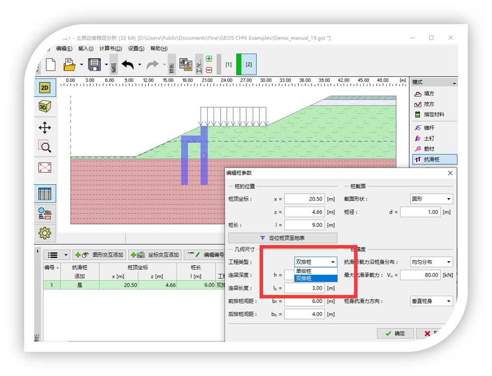 功能4:在边坡模块可以设置单排抗滑桩,也可以输入“门”型抗滑桩和“h”型抗滑桩。