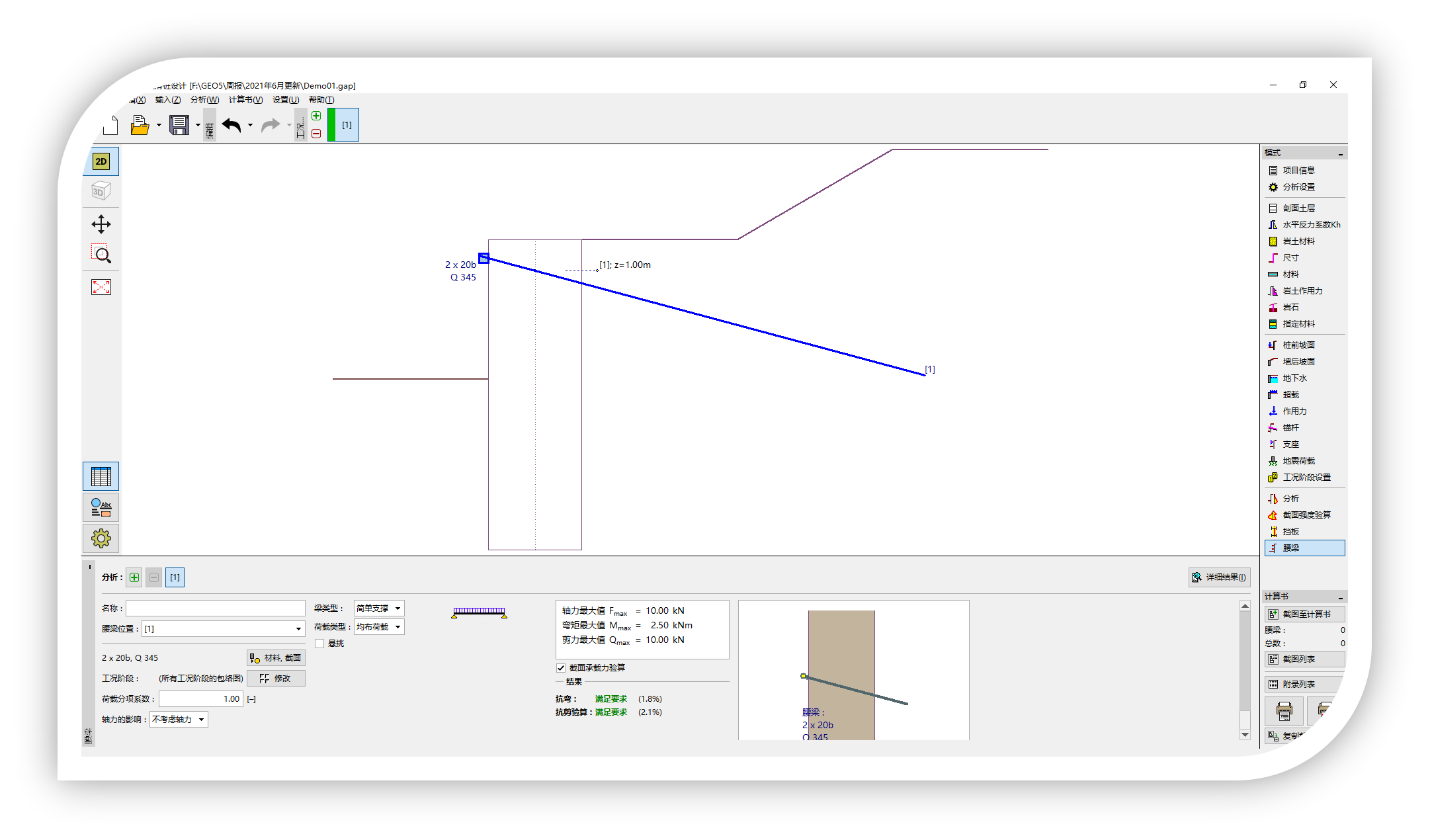 功能2:新增腰梁计算功能,可以添加钢腰梁或者混凝土的腰梁进行计算。此外,锚杆的验算也进行了优化,可以根据岩土材料输入极限粘结强度。