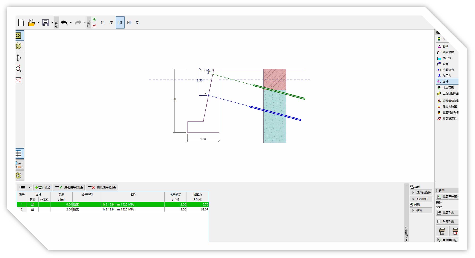 重力式挡土墙模块添加锚杆