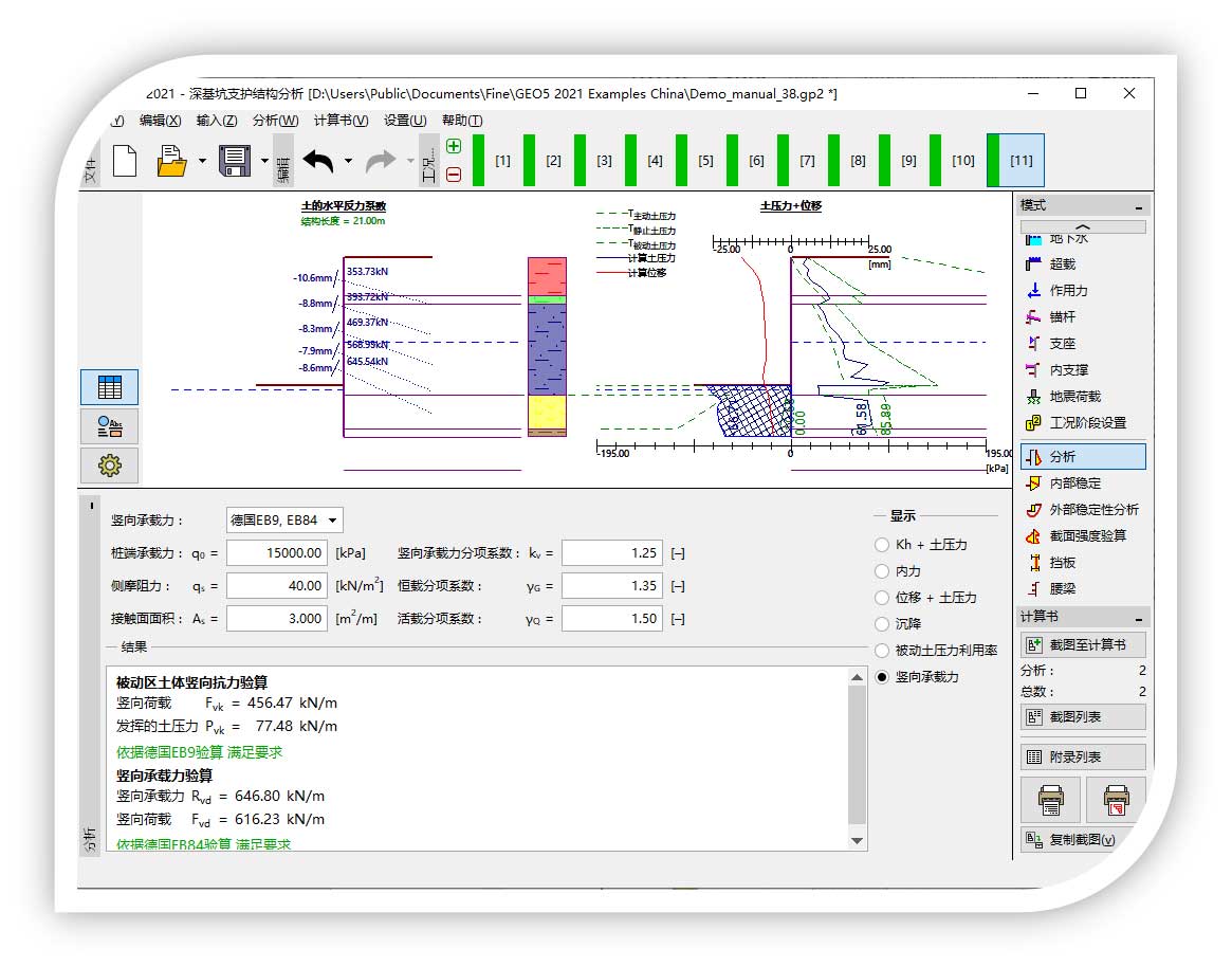 GEO5 2021年中更新正式发布,在调研用户需求基础上,新增或完善相关功能,提高软件的易用性、可靠性:优化CAD文件导入功能,可导入带填充图案样式的CAD文件;土坡模块新增水下参数输入,可自定义特定滑面的强度参数;抗滑桩模块新增挡土板和腰梁验算功能;重力式挡墙模块新增锚杆添加功能,可自动计算锚固力;深基坑模块可在桩顶新增竖向作用力,并进行竖向承载力验算;有限元模块新增动画输出功能,可将地震时程分析、渗流分析和固结分析结果以动画形式展示等。