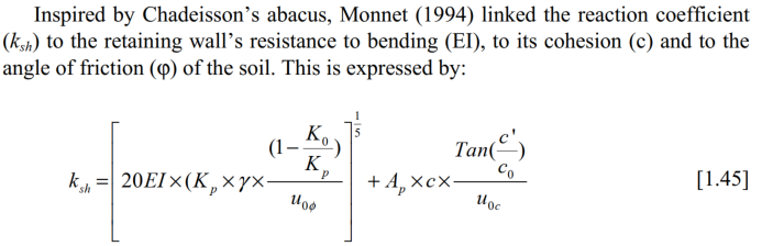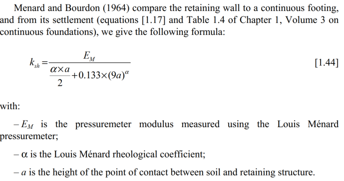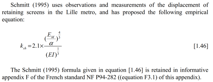 欧标不同国家有一定差异,介于中国用户的常见使用范围,这里以德法为主介绍。德法标准中常用的方法有Terzaghi (1955),Ménard et Rousseau (1962),Balay (1984),Chadeisson (in Monnet, 1994),Schmitt( 1995)等。目前GEO5中内置的有Ménard,Chadeisson,Schmitt及一些欧标规范要求的原位测试(PMT等)方法,相关理论的公式给出如下: