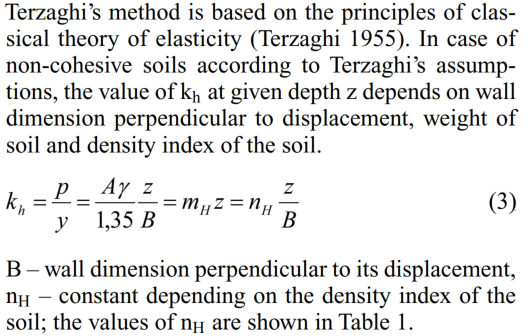 美标在EM,AASHTO,FHWA等不同行业的规范体系中均有涉及基坑的内容,水平反力系数的取值多采用ATSM试验方法得出,有些实用手册中也可采用太沙基的理论,相关理论公式如下: