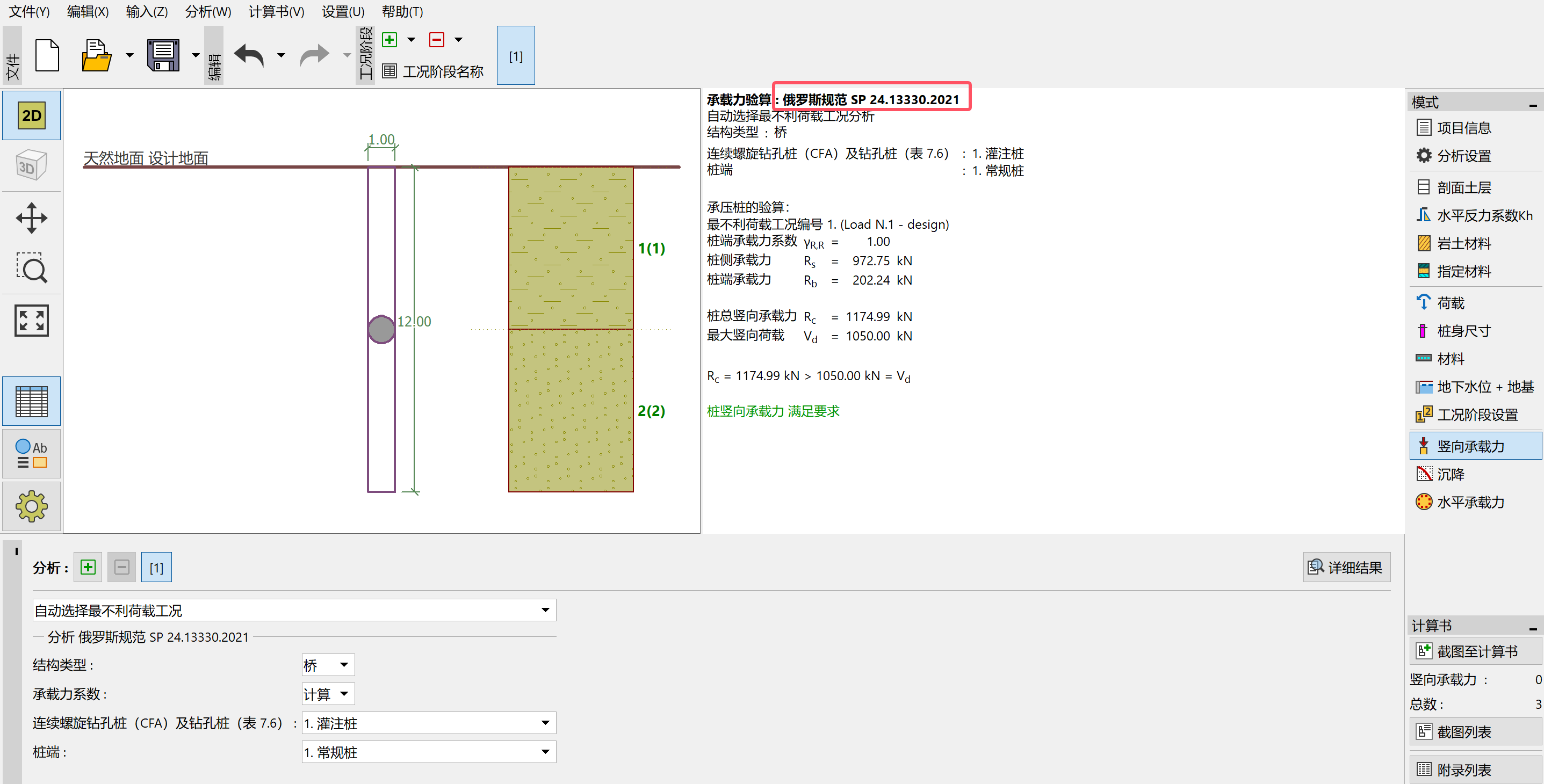 4、单桩设计和扩展基础设计模块新增多国规范方法,包括美国联邦公路管理局FHWA GEC10、法国国家标准NF P94-261、俄罗斯建筑规范SP 24.13300.2021、瑞典规范Nordlund和西班牙规范CTE-DB SE-C等。