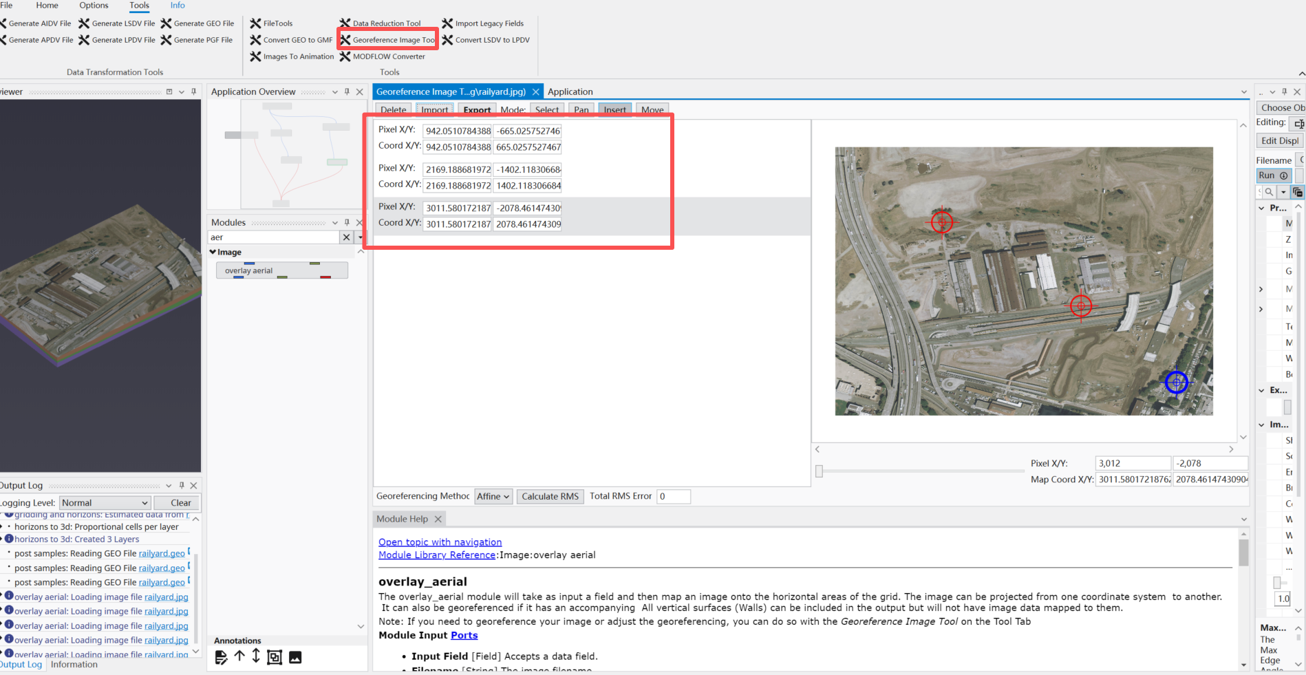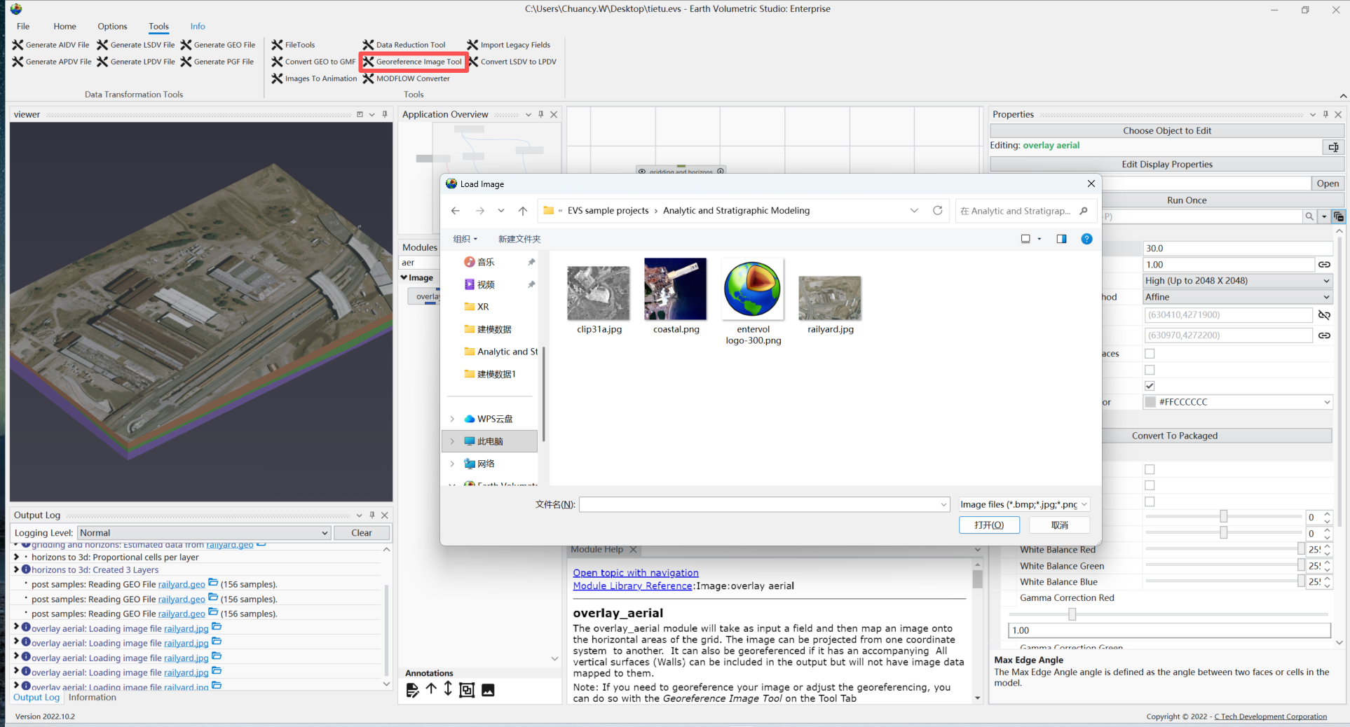 此时EVS可识别该.gcp文件,我们重复上一节的操作,后在overlay aerial模块的properties中,通过我们点击的已知坐标点的数量来选择不同的georeferencing method(EVS的模块的帮助文档中对此有详细的解释)。