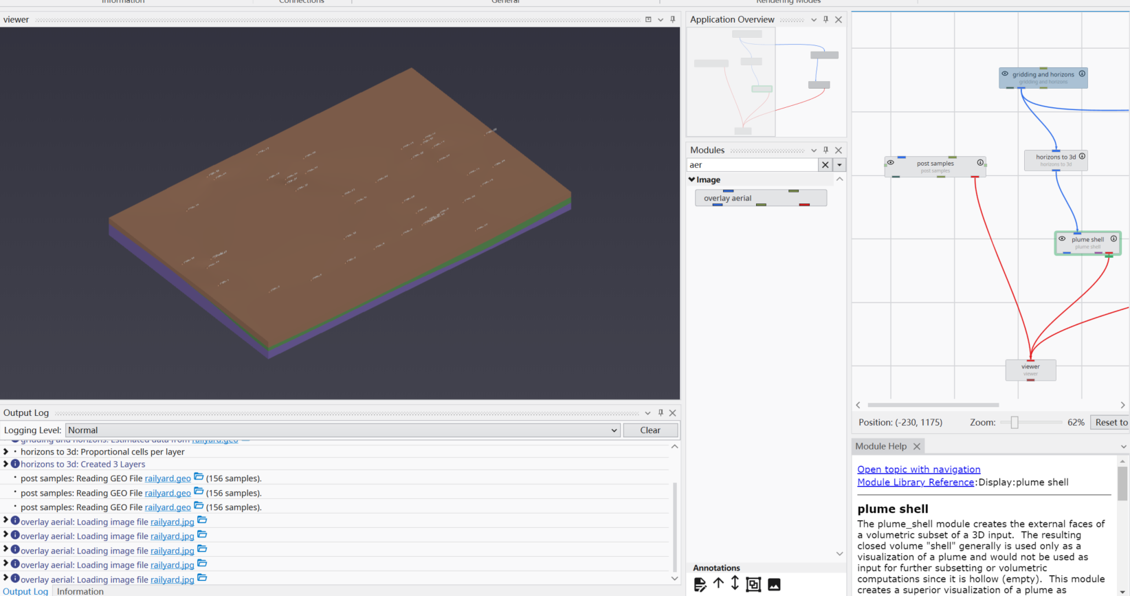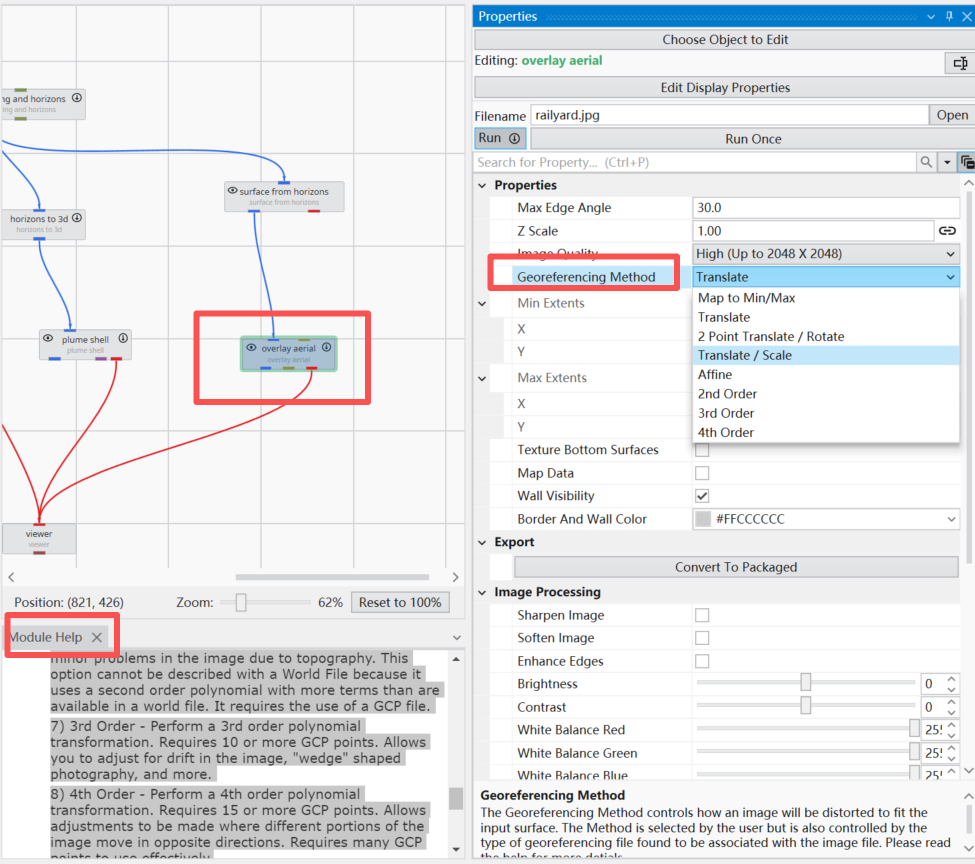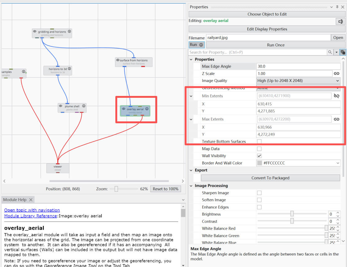 在设置好surface from horizons模块后链接到overlay aerial模块上,此时双击该模块,我们在filename中上传我们准备好的.jpg文件,然后我们可以看到标红处,即在properties中我们设置该图片的角点。