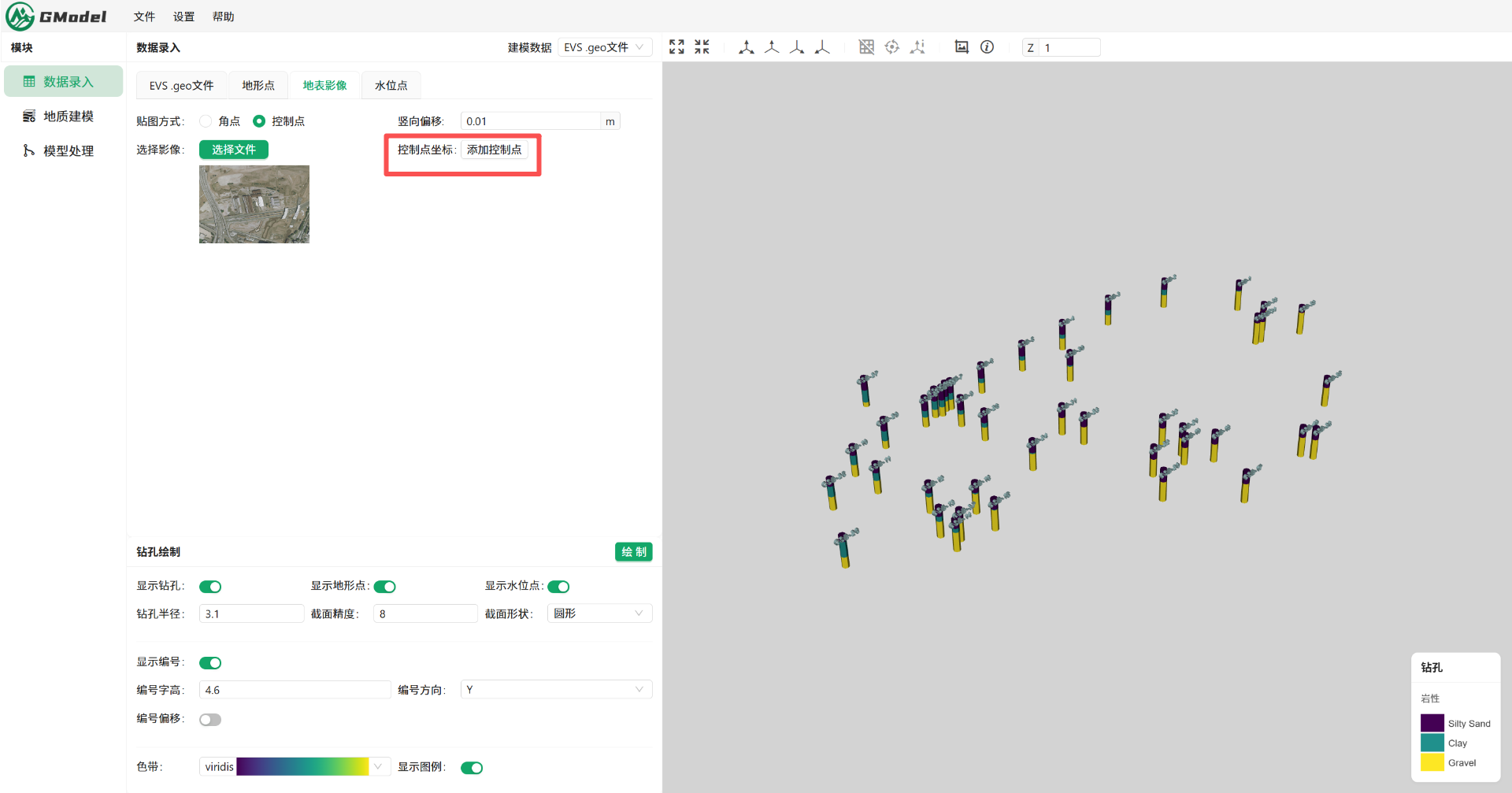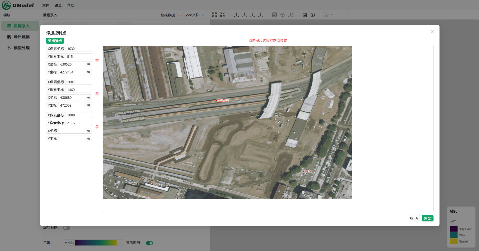 GModel支持直接在地表影像界面中将实际坐标赋予对应像素,实现快速配准。EVS则依赖外部.gcp文件,用户需提前创建文件并在软件中调用,且针对不同数量控制点需选择不同读取方式,流程繁琐且学习成本较高。