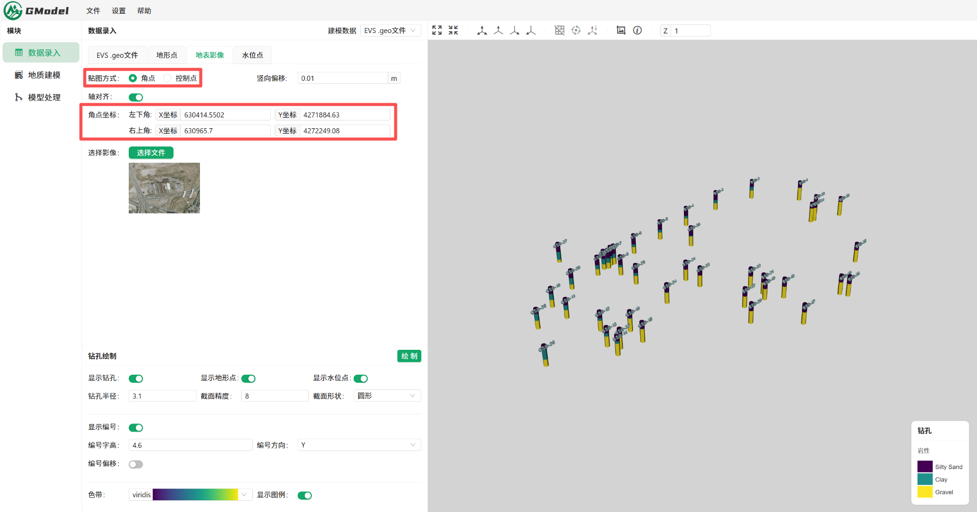 GModel数据录入界面中,包含地表影像的单独功能页面,当已知地表影像图片的左下角和右上角坐标时,可切换到该页面内将贴图方式选择角点后进行操作。