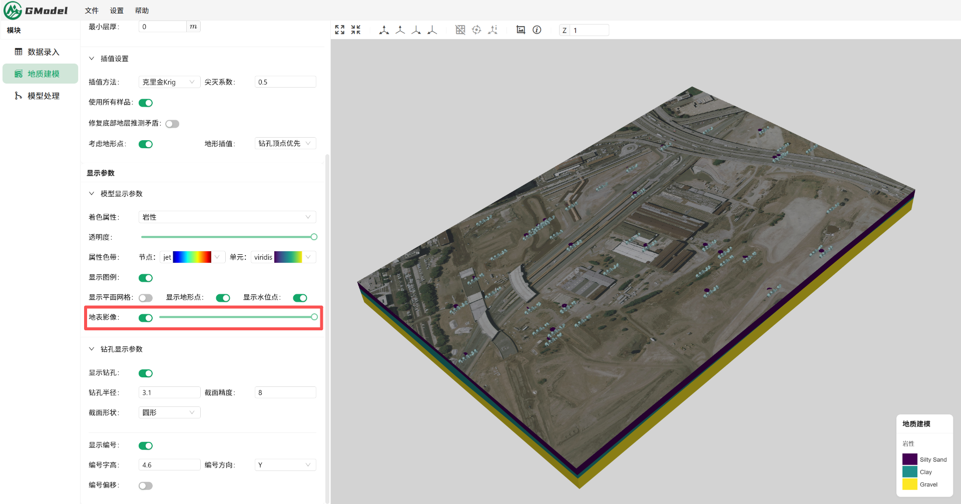 在地质建模界面,我们可以看到地表影像已经加载完成,此时我们可以通过「地表影像」开关来决定其是否显示,以及控制其透明度。