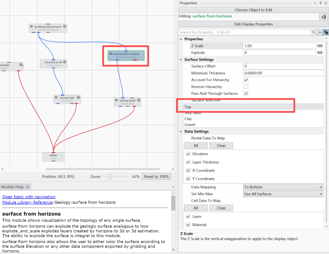 地质模型创建完成后,我们在gridding and horizons模块之后连接surface from horizons模块。该模块的作用是将我们上传的图片放在任意一层的界面处,如下我们双击该模块,在模块属性当中的surface settings中我们将surface selection选择到top处,即将地表影像图片放到模型最上方。