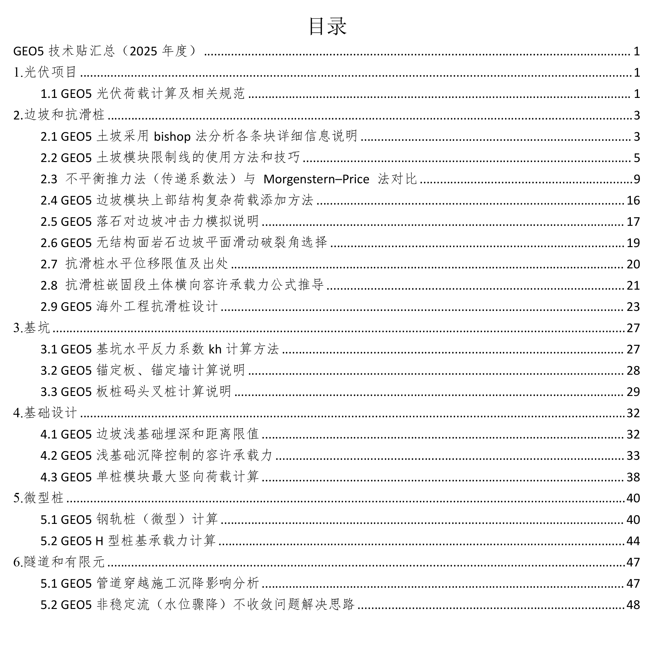 GEO5是一款广泛应用于岩土工程领域的计算软件,凭借强大的功能和灵活的应用,已成为工程设计和科研的重要工具。为了帮助用户更好地理解和使用GEO5,我们整理了《GEO5技术贴汇总(2025年度)》,按照工程类型与专业模块进行分类,涵盖光伏项目、边坡与抗滑桩、基坑工程、基础设计、微型桩,以及隧道与有限元分析等多个常见应用场景。内容既包括具体功能与参数设置的说明,也包含不同计算方法之间的对比分析、关键假定条件的讨论以及部分公式和理论依据的推导说明,力求在“软件操作”与“工程原理”之间建立清晰的对应关系。